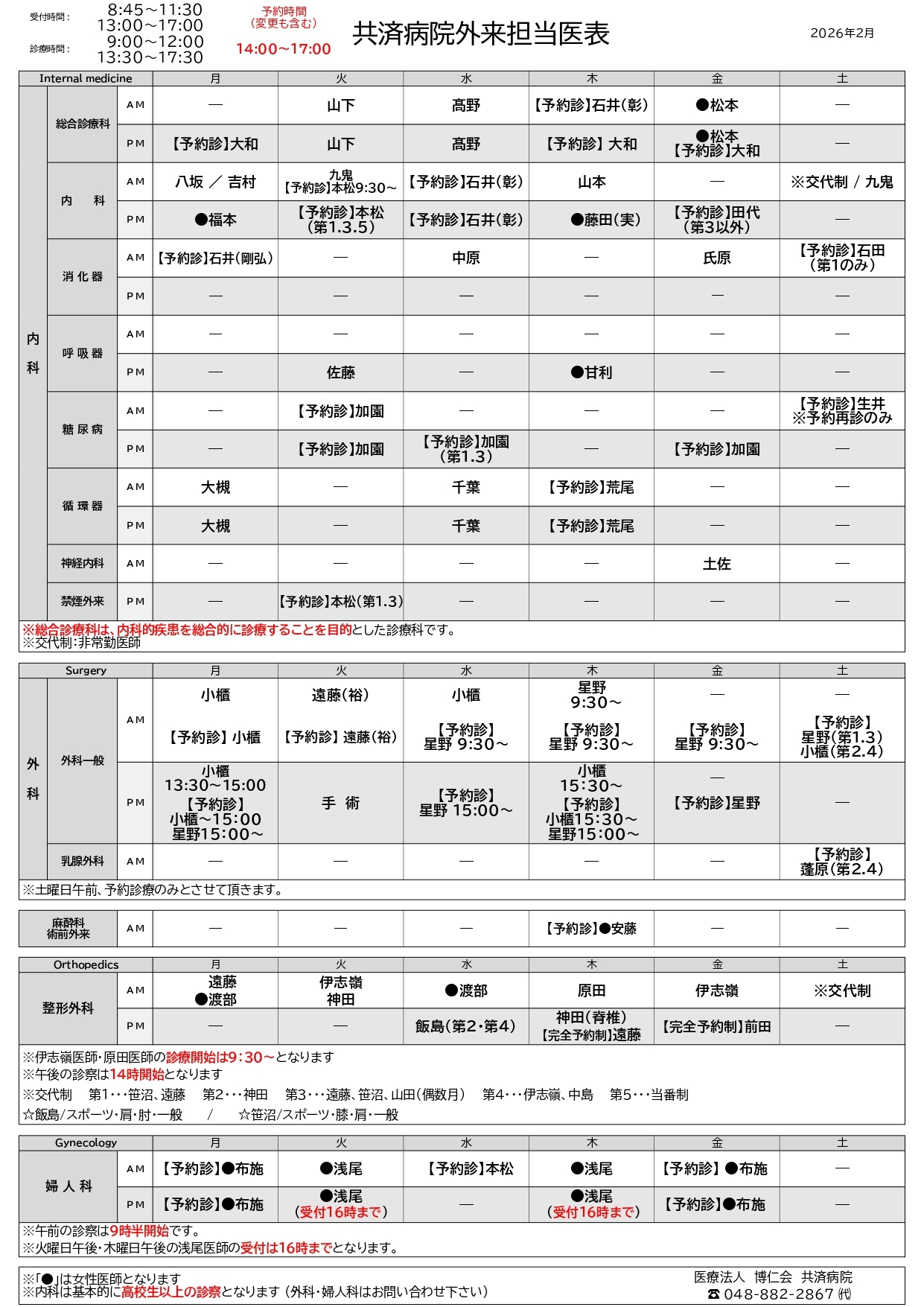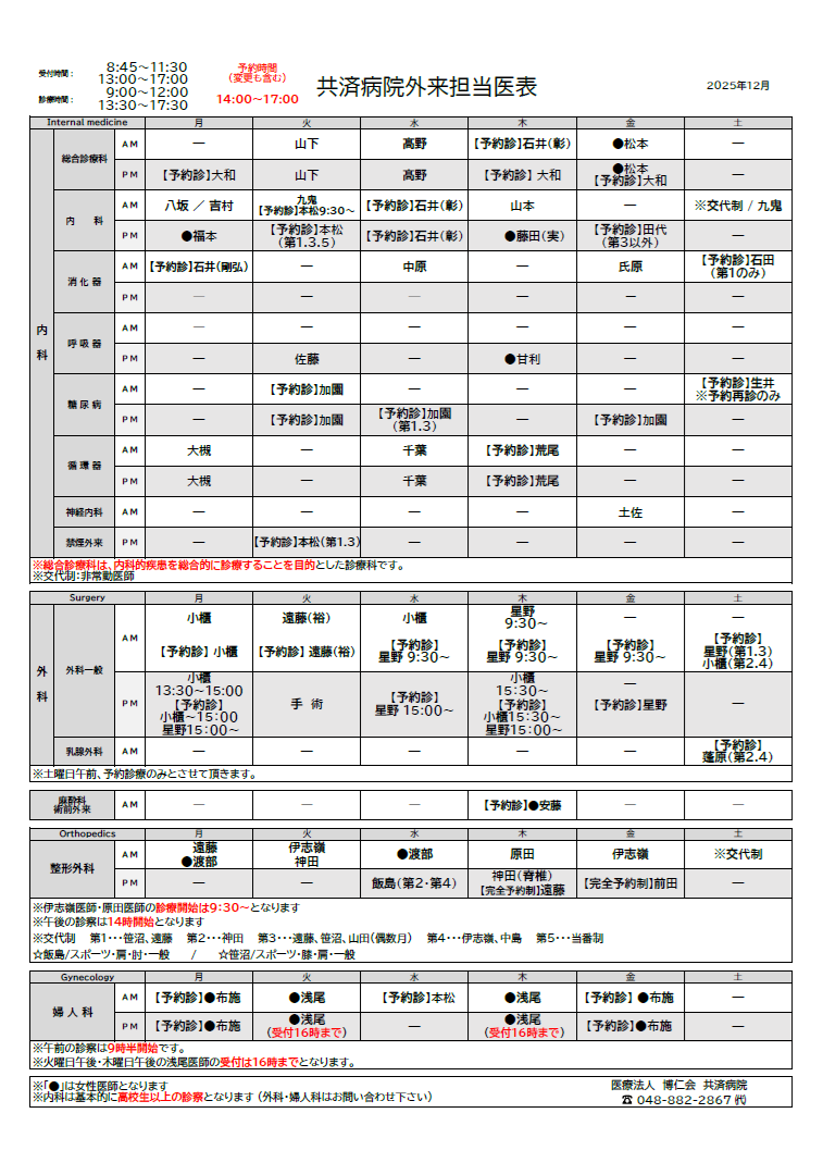 ※学会等により休診の場合や変更等が生じる場合がございます。